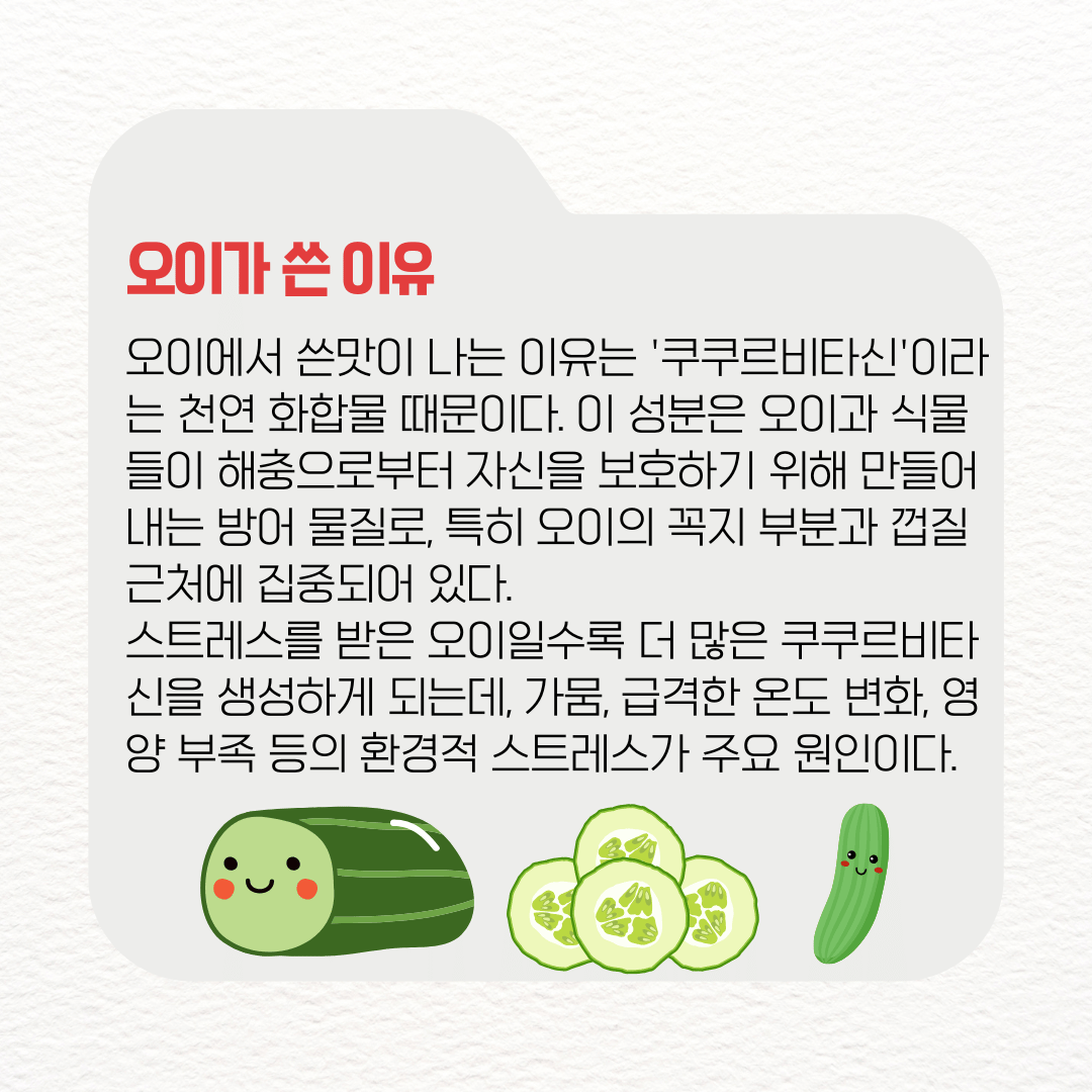 오이에서 쓴맛이 나는 이유는 '쿠쿠르비타신'이라는 천연 화합물 때문이다. 이 성분은 오이과 식물들이 해충으로부터 자신을 보호하기 위해 만들어내는 방어 물질인데, 특히 오이의 꼭지 부분과 껍질 근처에 집중되어 있다.