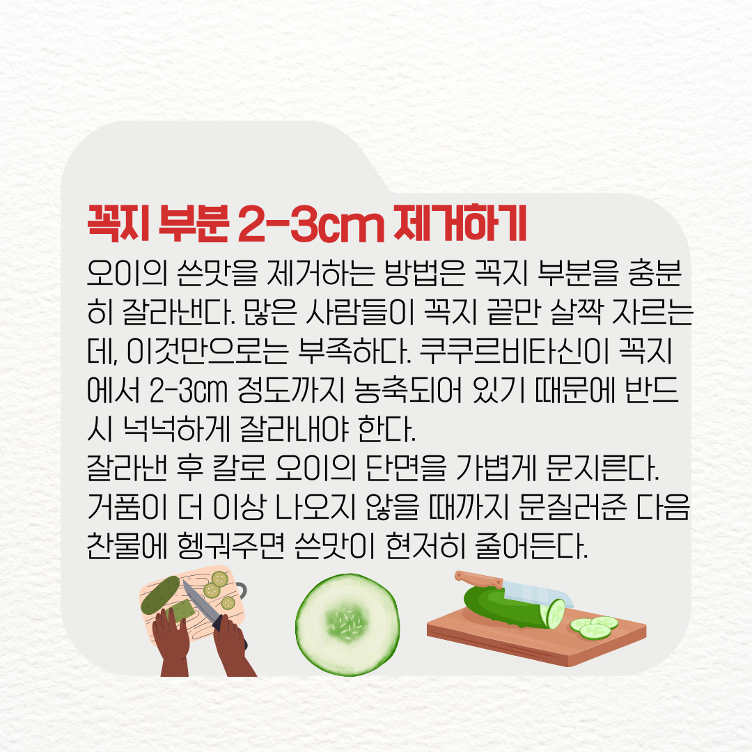 오이의 쓴맛을 제거하는 가장 기본적이고 효과적인 방법은 꼭지 부분을 충분히 잘라낸다. 많은 사람들이 꼭지 끝만 살짝 자르는데, 이것만으로는 부족하다. 쿠쿠르비타신이 꼭지에서 2-3cm 정도까지 농축되어 있기 때문에 반드시 넉넉하게 잘라내야 한다.