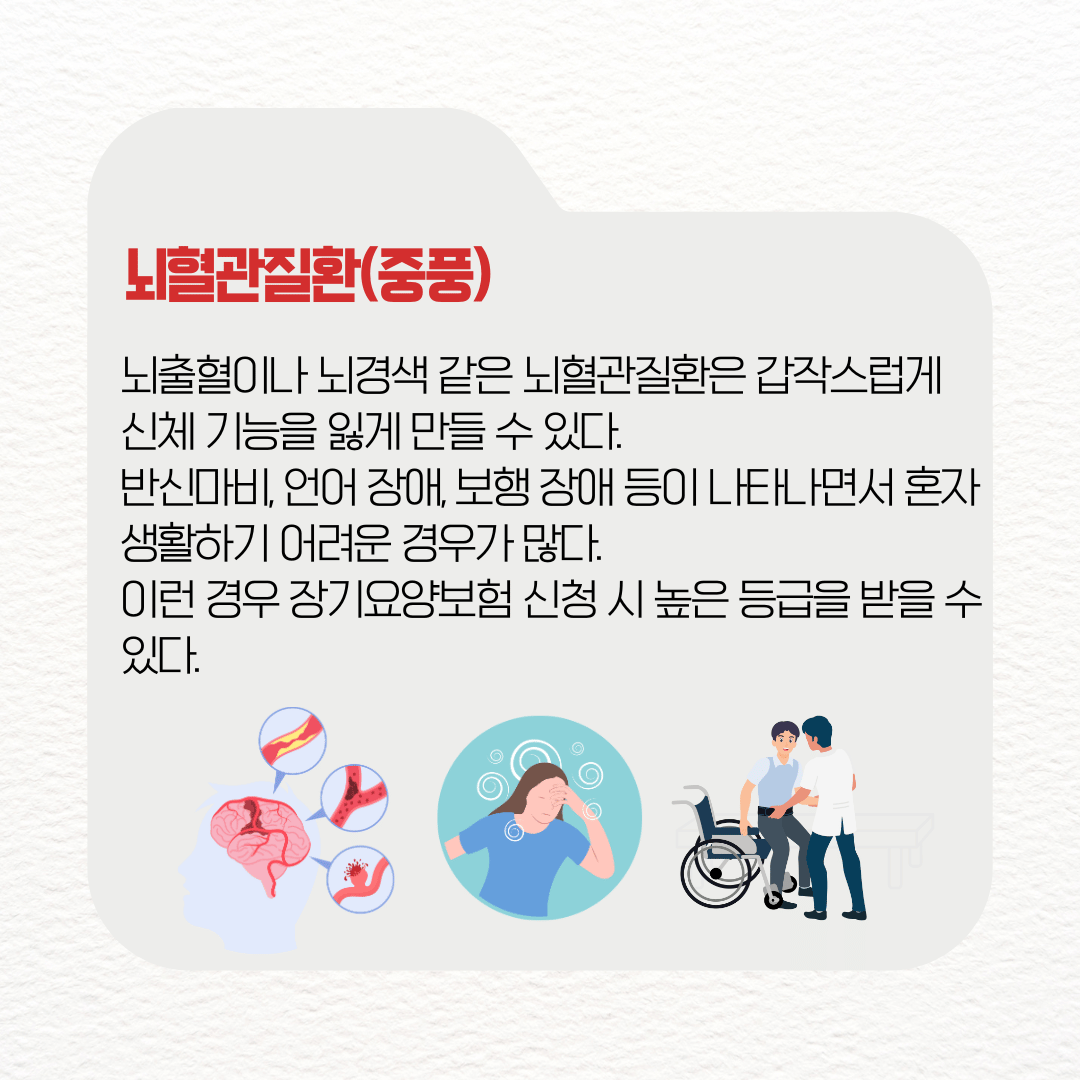 예를 들어 한쪽 팔이나 다리를 제대로 쓰지 못하거나, 언어장애, 삼킴 장애 등이 생겨 일상생활에 큰 제약을 받는다. 이런 경우 장기요양보험 등급 판정 시 높은 등급을 받을 가능성이 크며, 안정적인 돌봄 서비스를 받는 데 유리하다.