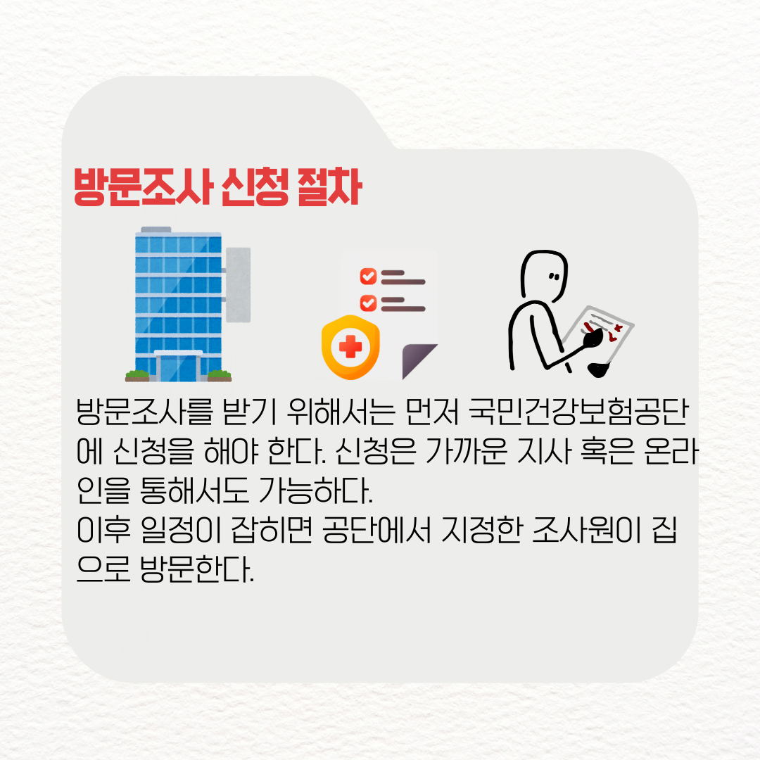방문조사를 받기 위해서는 먼저 국민건강보험공단에 신청을 해야 한다. 신청은 가까운 지사 혹은 온라인을 통해서도 가능하다.