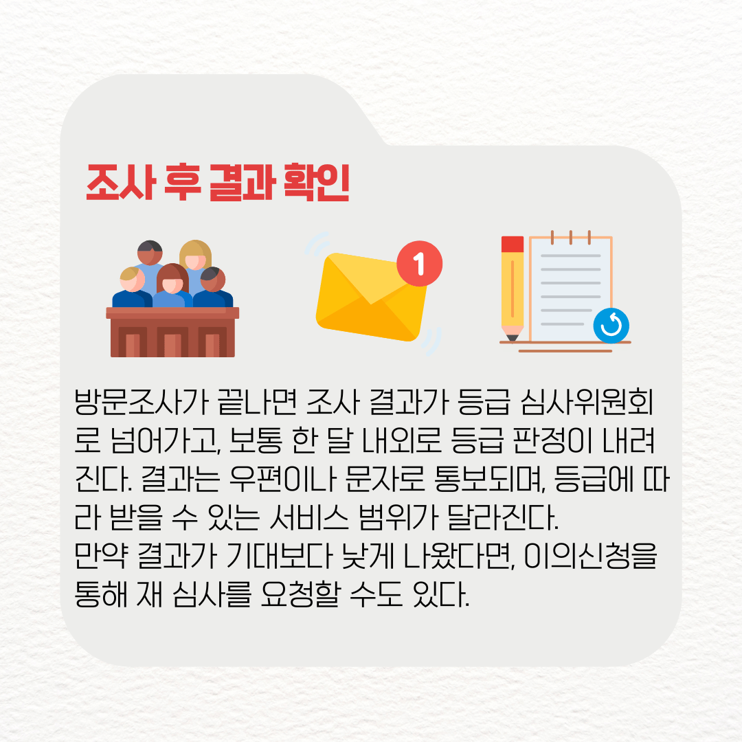 방문조사가 끝나면 조사 결과가 등급 심사위원회로 넘어가고, 보통 한 달 내외로 등급 판정이 내려진다. 결과는 우편이나 문자로 통보되며, 등급에 따라 받을 수 있는 서비스 범위가 달라진다.