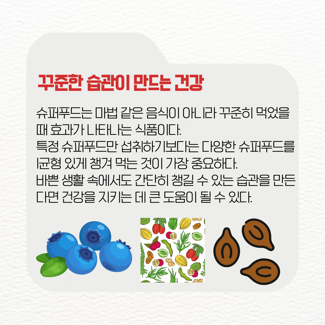 슈퍼푸드는 단번에 건강을 바꿔주는 마법 같은 음식은 아니다. 중요한 건 꾸준함이다. 다양한 슈퍼푸드를 매일 조금씩 섭취하면서 균형 잡힌 식단을 유지하는 게 핵심이다.