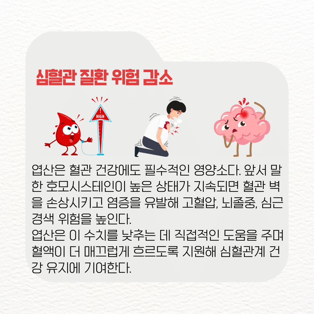 엽산은 이 수치를 낮추는 데 직접적인 도움을 주며 혈액이 더 매끄럽게 흐르도록 지원해 심혈관계 건강 유지에 기여한다. 꾸준한 엽산 섭취만으로도 혈관 나이를 건강하게 유지할 수 있다!