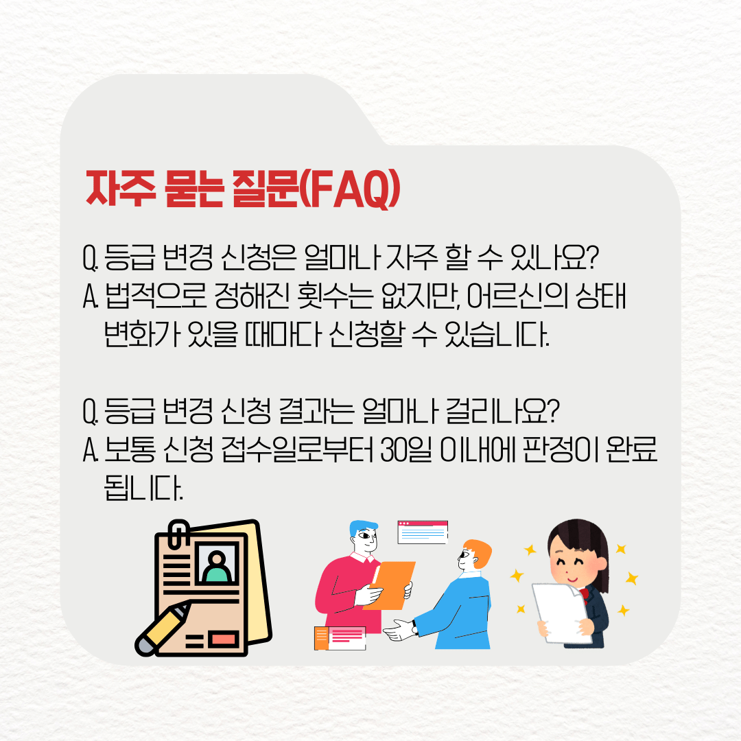 장기요양 등급을 받고 계신가요? 혹시 어르신의 건강 상태가 처음 등급을 받을 때와 달라져 더 많은 도움이 필요하거나, 반대로 상태가 호전되어 등급 조정을 고민하고 계신가요?