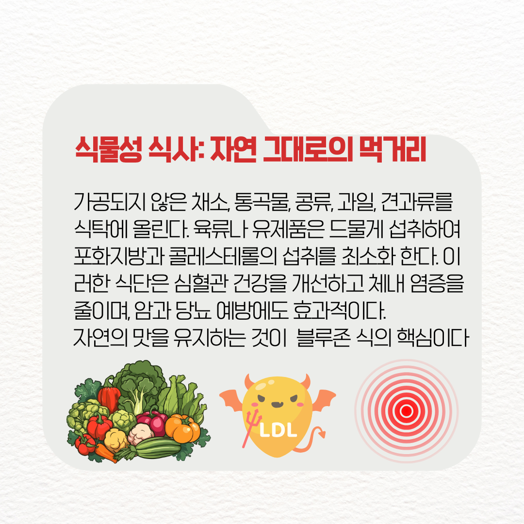 현대 의학도 주목하는 블루존은 단순한 지역 명칭을 넘어, 건강하게 나이 들기 위한 하나의 삶의 철학이자 식문화 지표로 자리 잡고 있다.