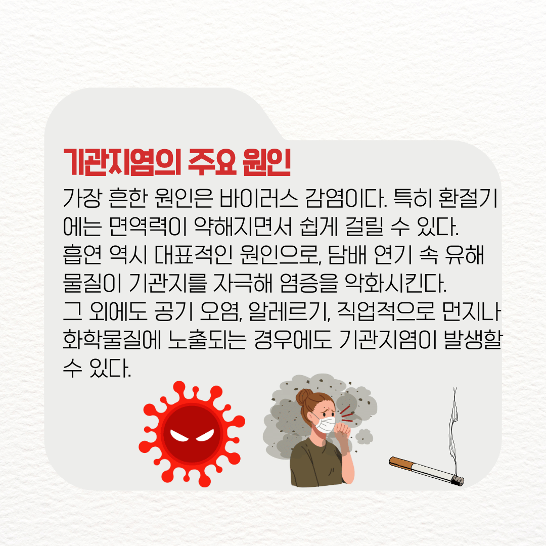흡연 역시 대표적인 원인으로, 담배 연기 속 유해 물질이 기관지를 자극해 염증을 악화시킨다. 그 외에도 공기 오염, 알레르기, 직업적으로 먼지나 화학물질에 노출되는 경우에도 기관지염이 발생할 수 있다.
