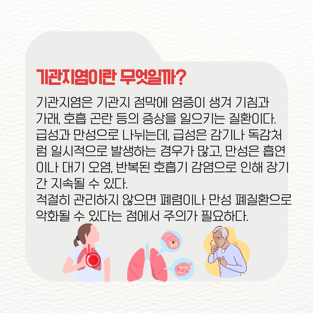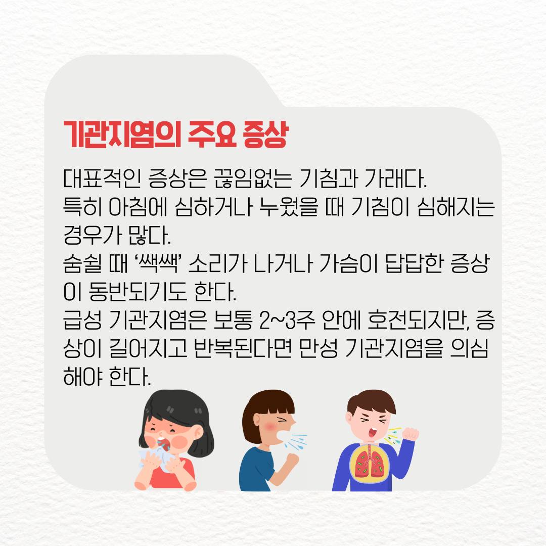 숨쉴 때 ‘쌕쌕’ 소리가 나거나 가슴이 답답한 증상이 동반되기도 한다. 급성 기관지염은 보통 2~3주 안에 호전되지만, 증상이 길어지고 반복된다면 만성 기관지염을 의심해야 한다.