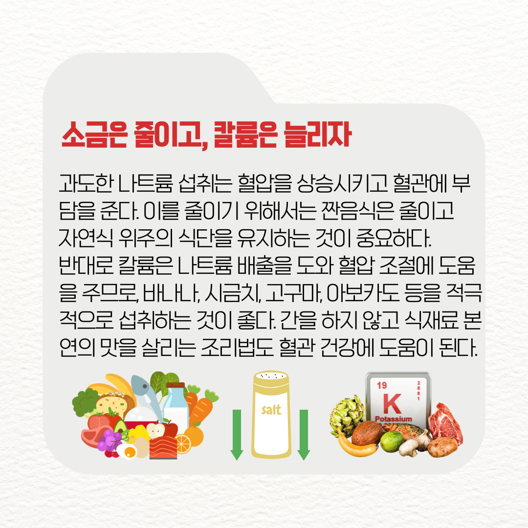 간식은 견과류 한 줌이나 제철 과일을 선택해 혈당과 혈압을 안정적으로 유지할 수 있도록 한다. 하루 1.5~2L의 수분 섭취도 잊지 말자. 이렇게 꾸준히 실천한다면 혈관은 물론 전신 건강까지 함께 지킬 수 있다.