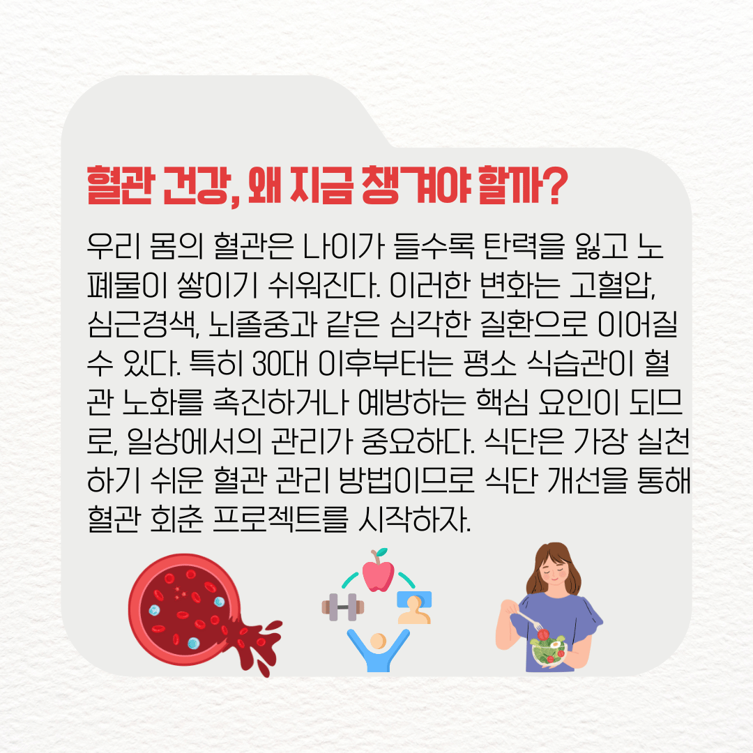이러한 변화는 고혈압, 동맥경화, 심근경색, 뇌졸중 같은 심각한 질환으로 이어질 수 있기 때문에, 중년 이후뿐 아니라 20~30대부터도 미리미리 관리하는 것이 중요하다.