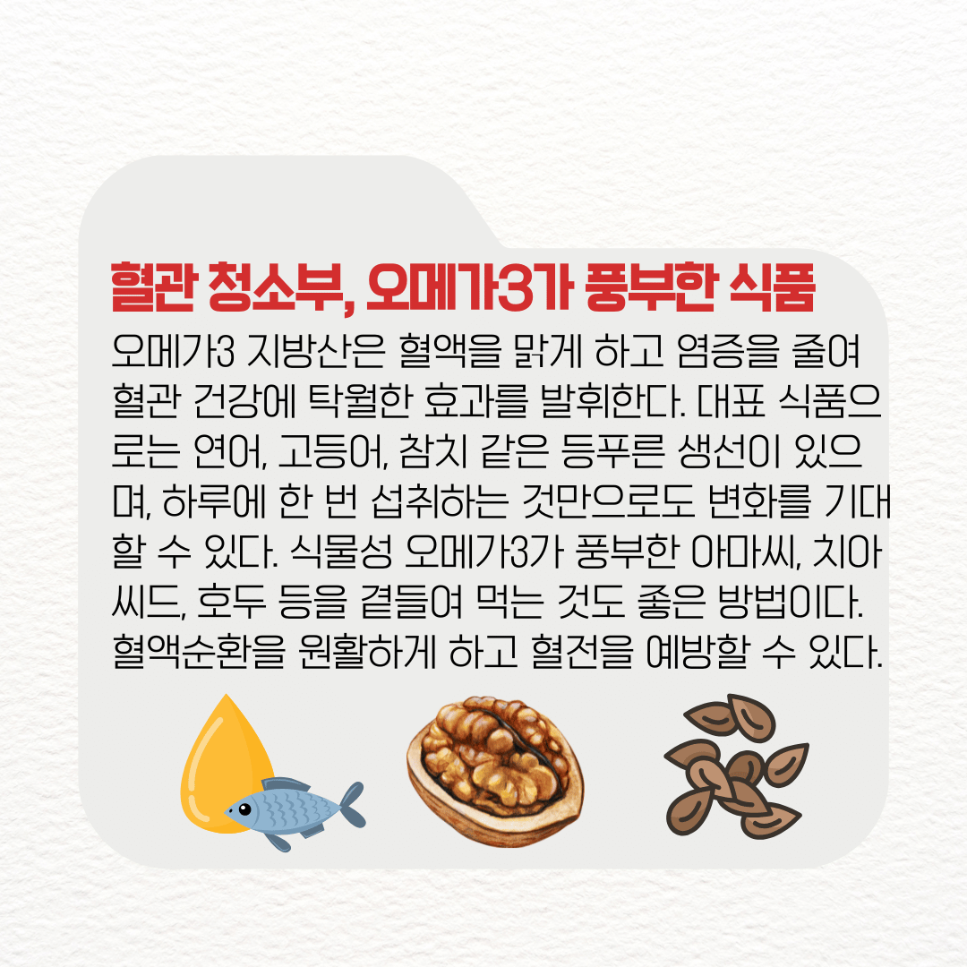 오메가-3 지방산은 혈액 속 중성지방 수치를 낮추고, 염증을 줄이며, 혈관 내벽을 부드럽게 해주는 강력한 역할을 한다. 특히 연어, 고등어, 정어리, 참치 같은 등푸른 생선은 오메가-3가 풍부하게 들어 있어 주 2~3회 섭취하면 혈관 건강에 큰 도움이 된다.