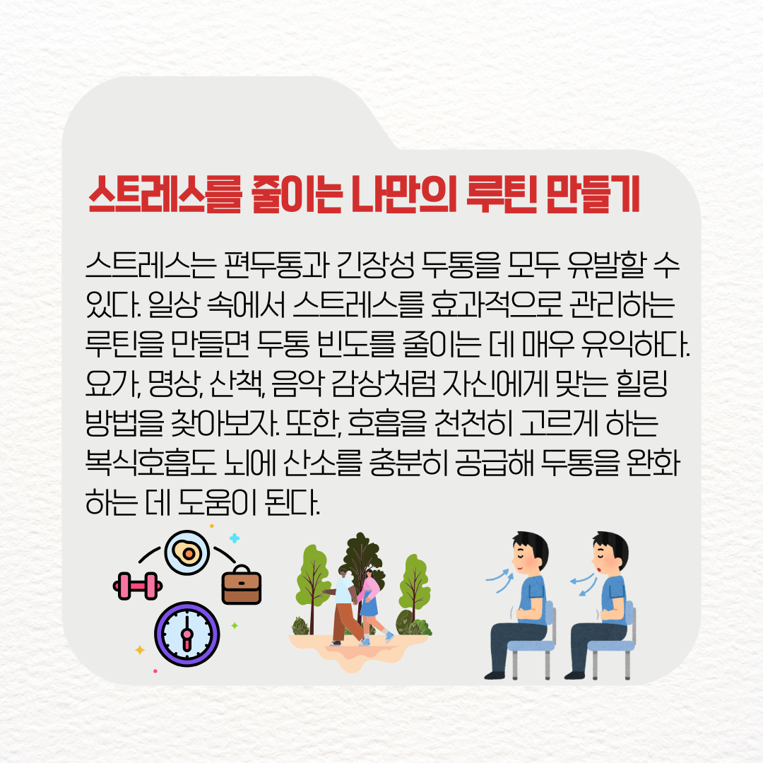 예를 들어 매일 10분간의 명상이나 호흡 운동은 마음을 안정시키고 뇌에 산소를 충분히 공급해 두통 완화에 도움을 준다. 규칙적인 산책이나 가벼운 운동도 신체의 긴장을 풀고 기분을 전환시키는 데 효과적이다.