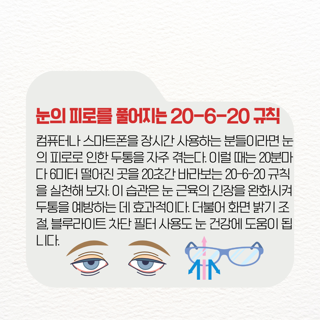 장시간 컴퓨터나 스마트폰을 사용할 경우 눈의 근육이 과도하게 긴장하면서 피로가 누적되고, 이로 인해 시각성 두통이 생길 수 있다. 이런 두통을 예방하려면 ‘20-20-20 규칙’을 실천하는 것이 도움이 된다.