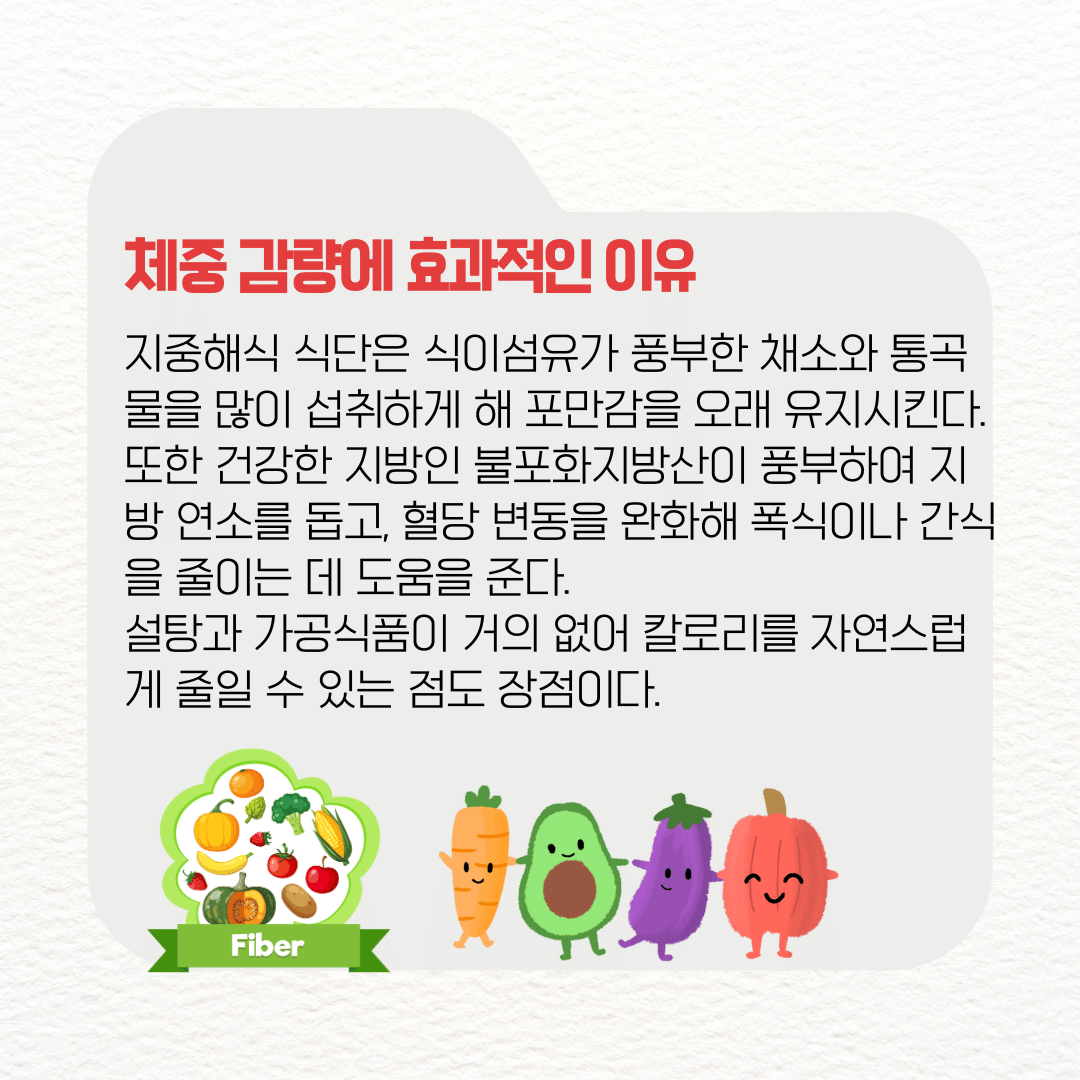 지중해식 식단은 식이섬유가 풍부해 소화가 천천히 이루어지고 포만감이 오래 지속된다. 통곡물, 채소, 과일은 혈당 급상승을 막아 폭식을 예방하고, 불포화지방이 풍부한 올리브 오일과 견과류는 지방 연소를 촉진한다.