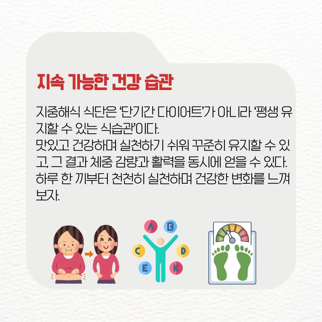 지중해식 식단은 맛있고 영양가 높으며 실천하기 쉬운 식습관이다. 억지로 참고 굶는 다이어트가 아니라, 평생 유지할 수 있는 ‘건강한 생활 방식’이라는 점이 가장 큰 장점이다.