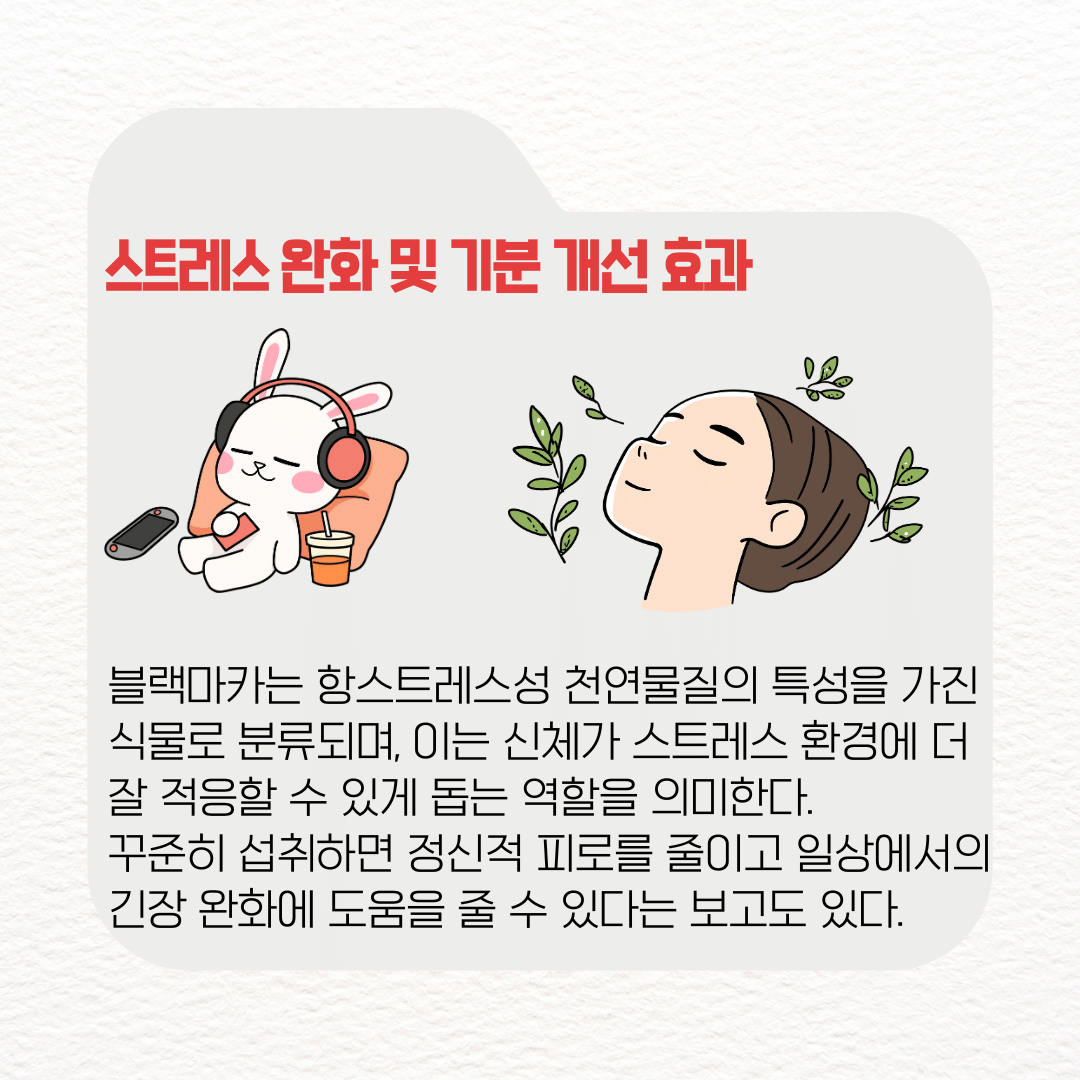 블랙마카는 아답토젠 특성을 가진 식물로 분류되며, 이는 신체가 스트레스 환경에 더 잘 적응할 수 있게 돕는 역할을 의미한다. 꾸준히 섭취하면 정신적 피로를 줄이고 일상에서의 긴장 완화에 도움을 줄 수 있다는 보고도 있다.