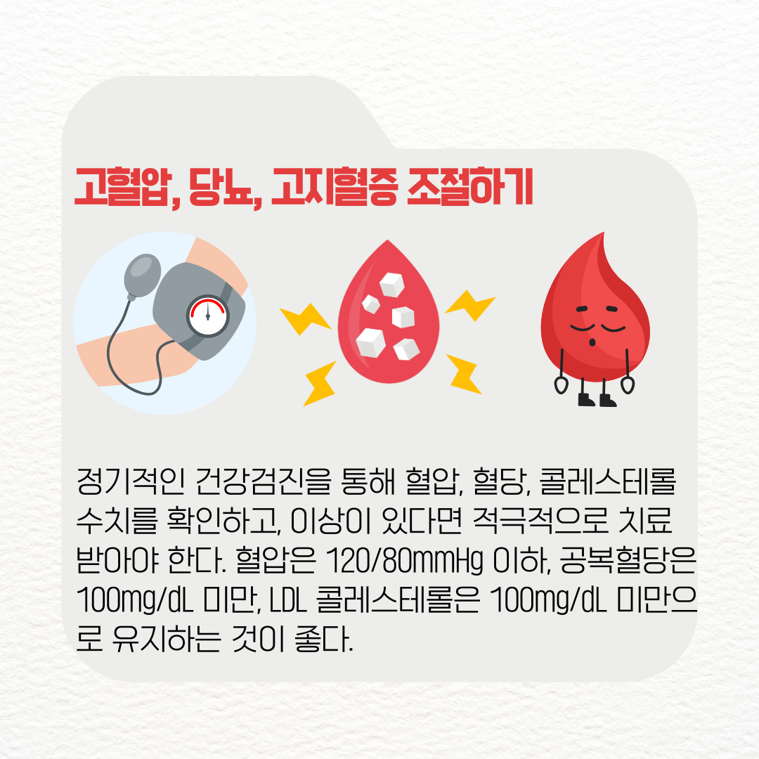 정기적인 건강검진을 통해 혈압, 혈당, 콜레스테롤 수치를 확인하고, 이상이 있다면 적극적으로 치료받아야 한다. 혈압은 120/80mmHg 이하, 공복혈당은 100mg/dL 미만, LDL 콜레스테롤은 100mg/dL 미만으로 유지하는 것이 좋다.