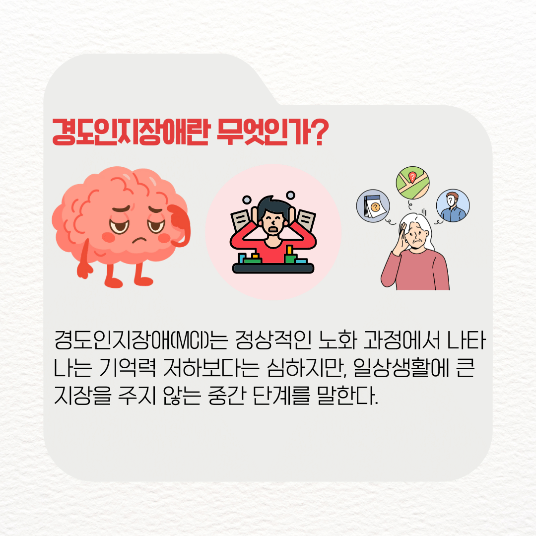 경도인지장애(MCI)는 정상적인 노화 과정에서 나타나는 기억력 저하보다는 심하지만, 일상생활에 큰 지장을 주지 않는 중간 단계를 말한다.