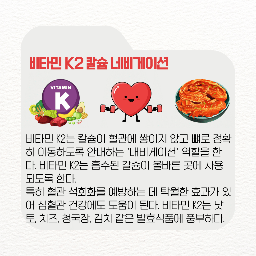 비타민 K2는 칼슘이 혈관에 쌓이지 않고 뼈로 정확히 이동하도록 안내하는 '내비게이션' 역할을 한다. 비타민 D가 칼슘 흡수를 돕는다면, 비타민 K2는 흡수된 칼슘이 올바른 곳에 사용되도록 한다.