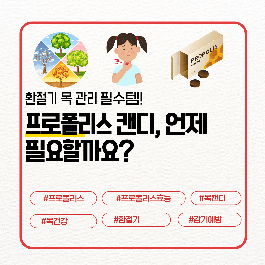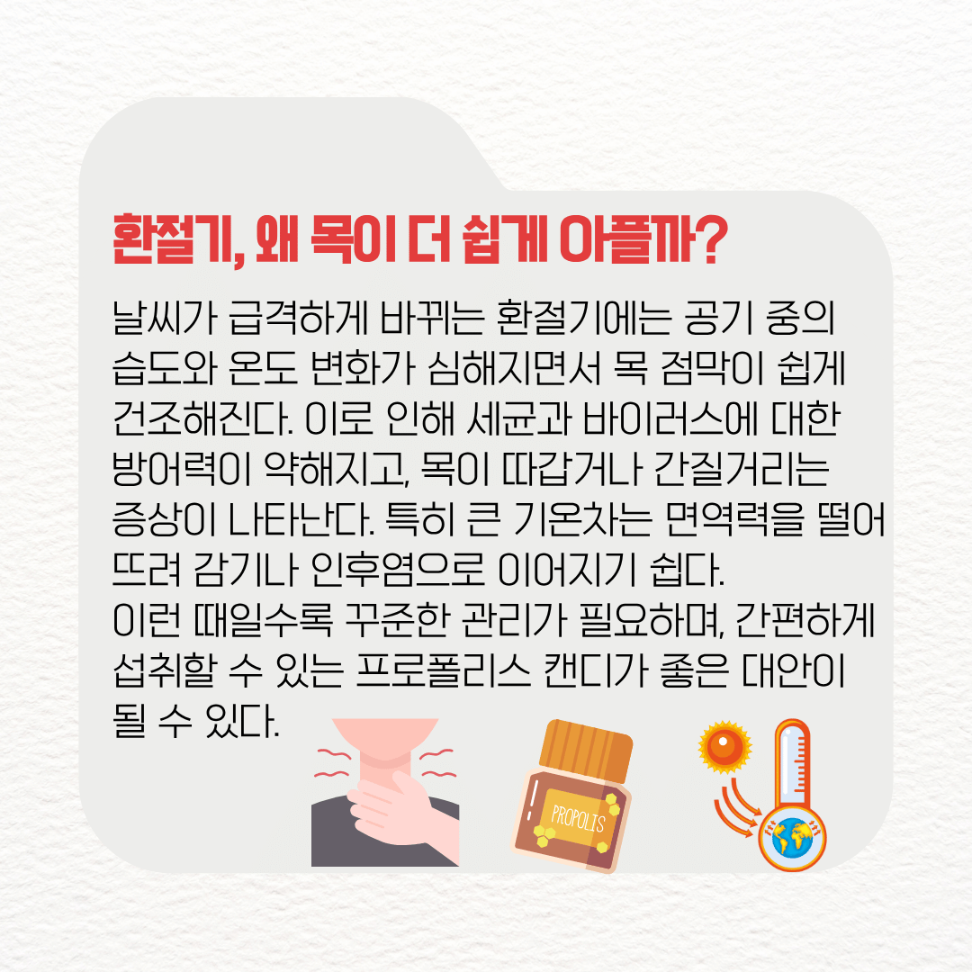 특히 아침과 저녁의 큰 기온차는 면역력을 떨어뜨려 감기나 인후염으로 이어지기 쉬운 시기이며 이런 때일수록 목 건강을 위한 꾸준한 관리가 필요하며, 간편하게 섭취할 수 있는 프로폴리스 캔디가 좋은 대안이 될 수 있다.