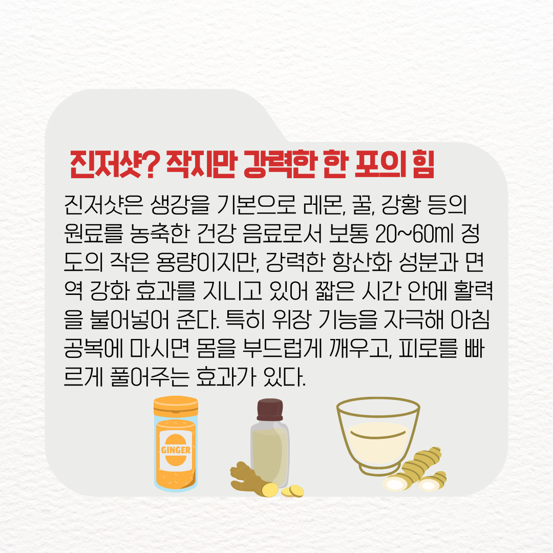 커피나 에너지 음료보다 자극이 적고 자연적인 방식으로 활력을 불어넣는 진저샷은, 바쁜 현대인들의 아침 건강 루틴에 꼭 필요한 아이템이다.