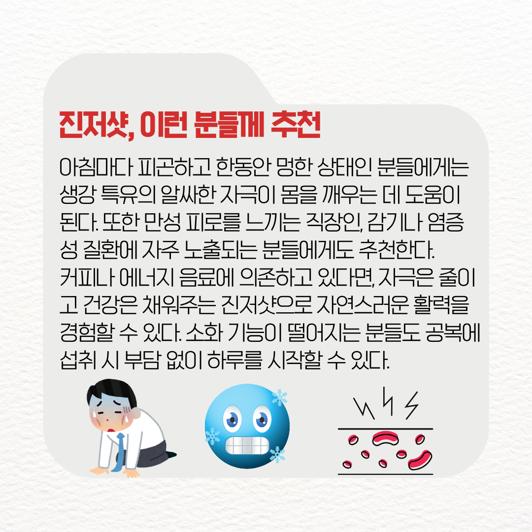진저샷은 간편하면서도 효과적인 건강 루틴으로, 바쁜 현대인들에게 특히 유용한 아이템이다. 아침마다 피곤하고 기상 후 한동안 멍한 상태가 지속되는 분들에게는 생강 특유의 알싸한 자극이 몸을 빠르게 깨우는 데 도움이 된다.