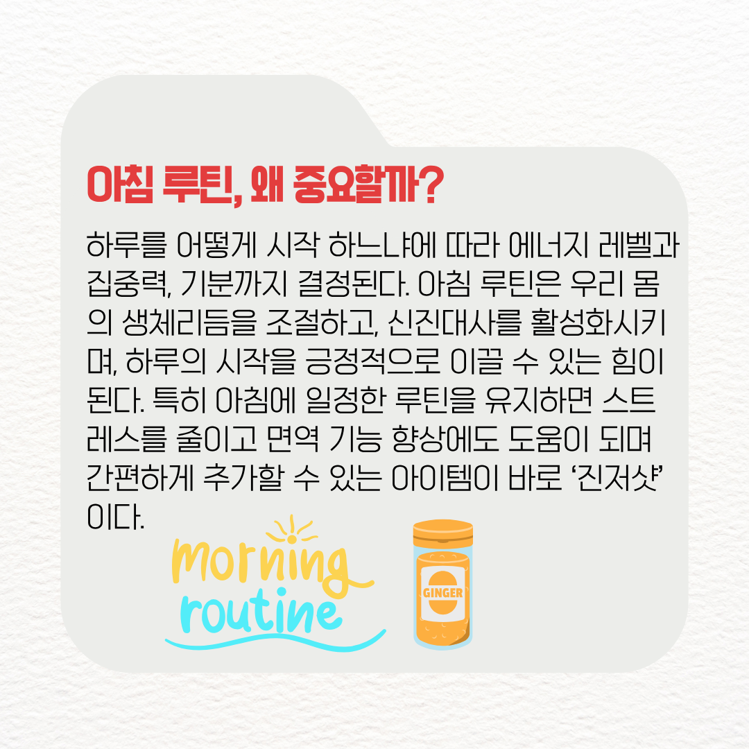 특히 ‘진저샷’ 같은 기능성 음료를 아침 루틴에 포함하면 몸과 마음을 빠르게 깨우는 데 큰 도움이 된다. 건강한 하루를 위한 가장 확실한 투자, 바로 아침 루틴이다.