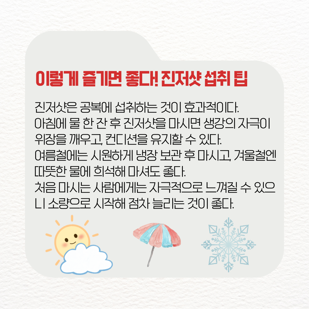 여름철에는 냉장 보관 후 시원하게 즐기면 상쾌함이 배가되고, 겨울철에는 따뜻한 물에 진저샷을 희석해 마시면 속이 편안해지면서 혈액순환에도 도움이 된다.