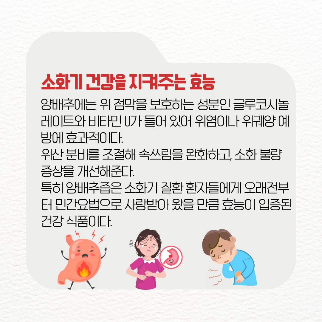 현대인들은 불규칙한 식습관과 스트레스로 위 건강이 쉽게 약해지는데, 양배추를 꾸준히 섭취하면 속쓰림이나 더부룩함 같은 증상을 줄이는 데 도움이 된다.