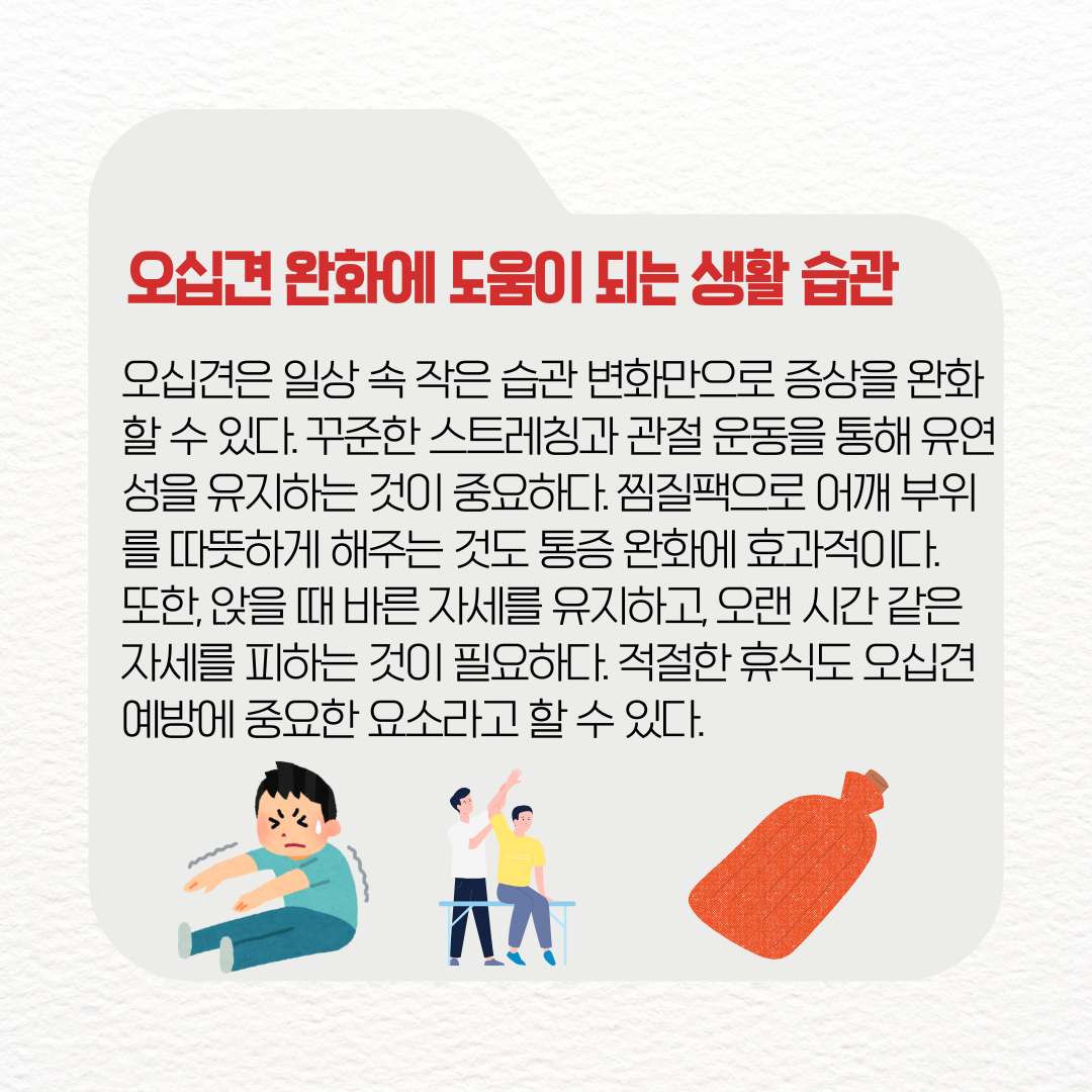 오십견은 일상 속 작은 습관 변화만으로도 증상을 완화할 수 있다. 무리한 어깨 사용을 줄이고, 꾸준한 스트레칭과 가벼운 관절 운동을 통해 유연성을 유지하는 것이 중요하다.