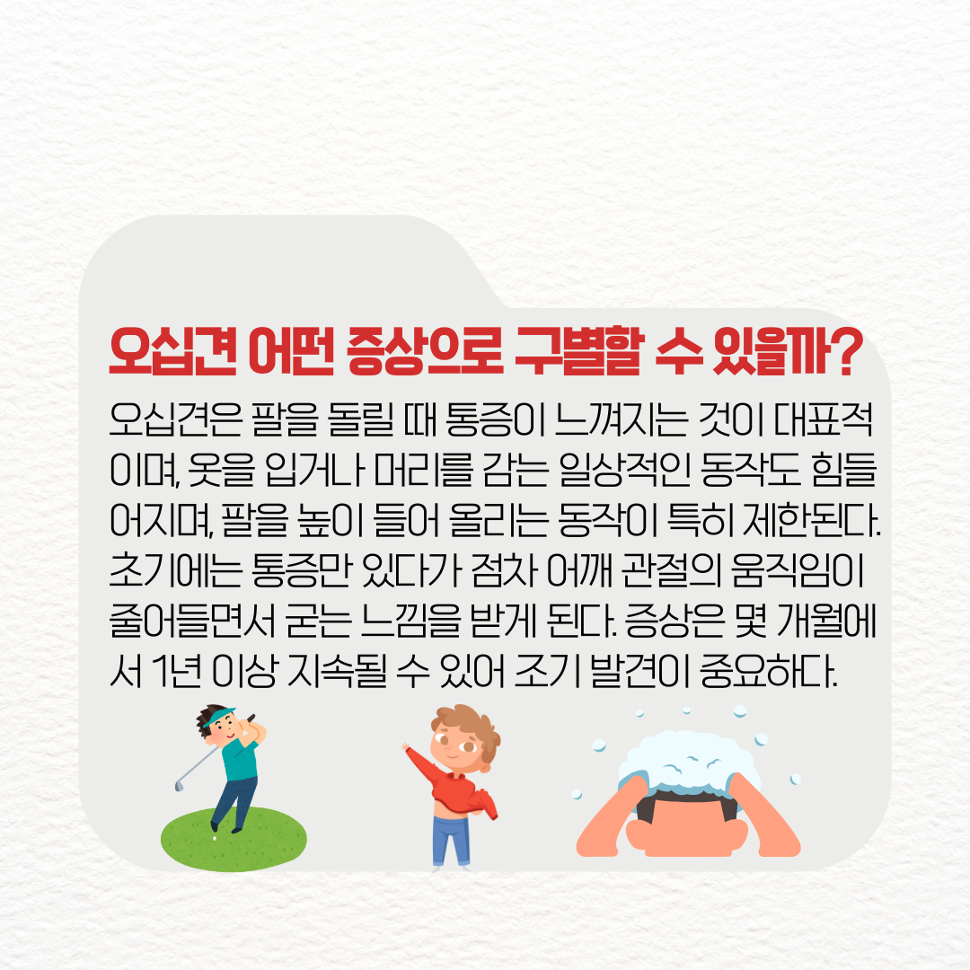 일상 속 작은 불편함으로 시작되는 어깨 통증, 혹시 오십견의 신호일까? 방치하면 더 큰 문제로 이어질 수 있는 오십견, 그 원인과 예방법, 그리고 집에서 할 수 있는 관리법까지 지금 확인해보자!