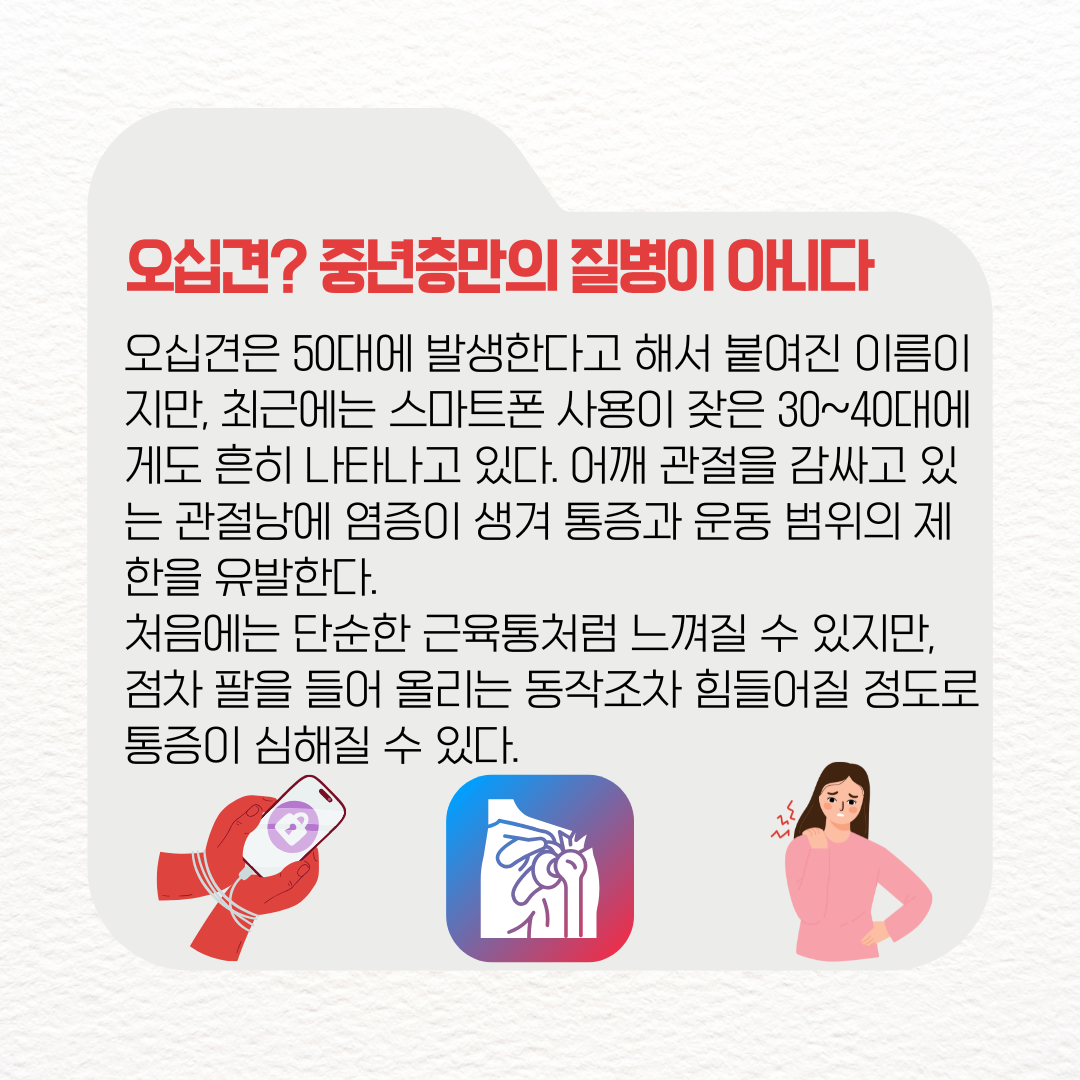 오십견은 흔히 50대에 자주 발생한다고 해서 붙여진 이름이지만, 최근에는 스마트폰, 컴퓨터 사용이 잦은 30~40대에게도 흔히 나타나고 있다.