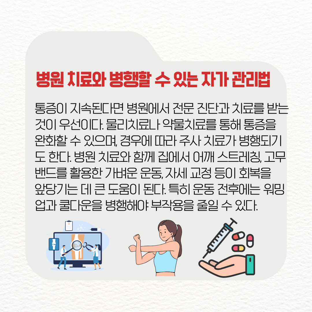 병원 치료와 함께 집에서 실천할 수 있는 어깨 스트레칭, 고무 밴드를 활용한 가벼운 운동, 자세 교정 등이 회복을 앞당기는 데 큰 도움이 된다. 특히 운동 전후에는 반드시 충분한 워밍업과 쿨다운을 병행해야 부작용을 줄일 수 있다.