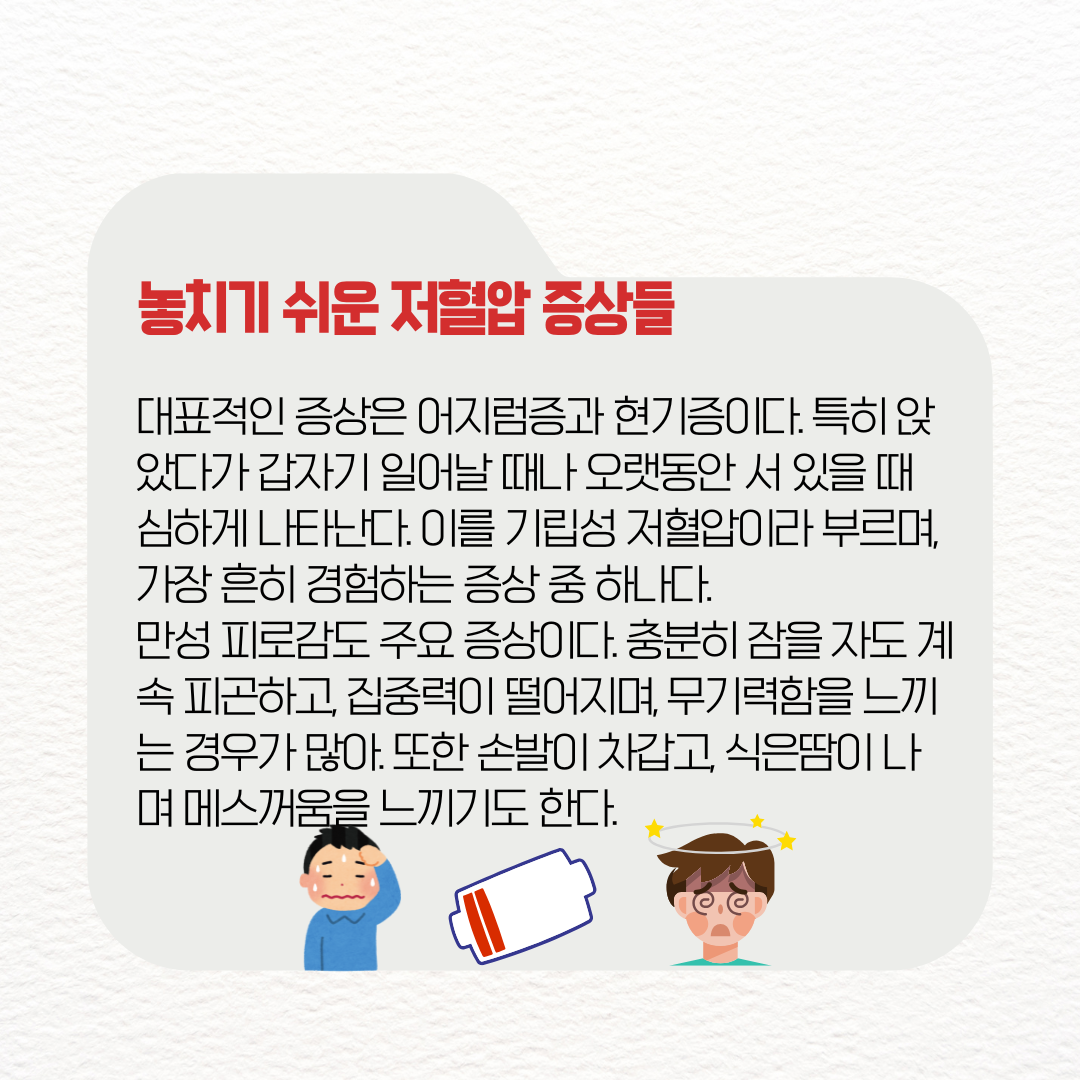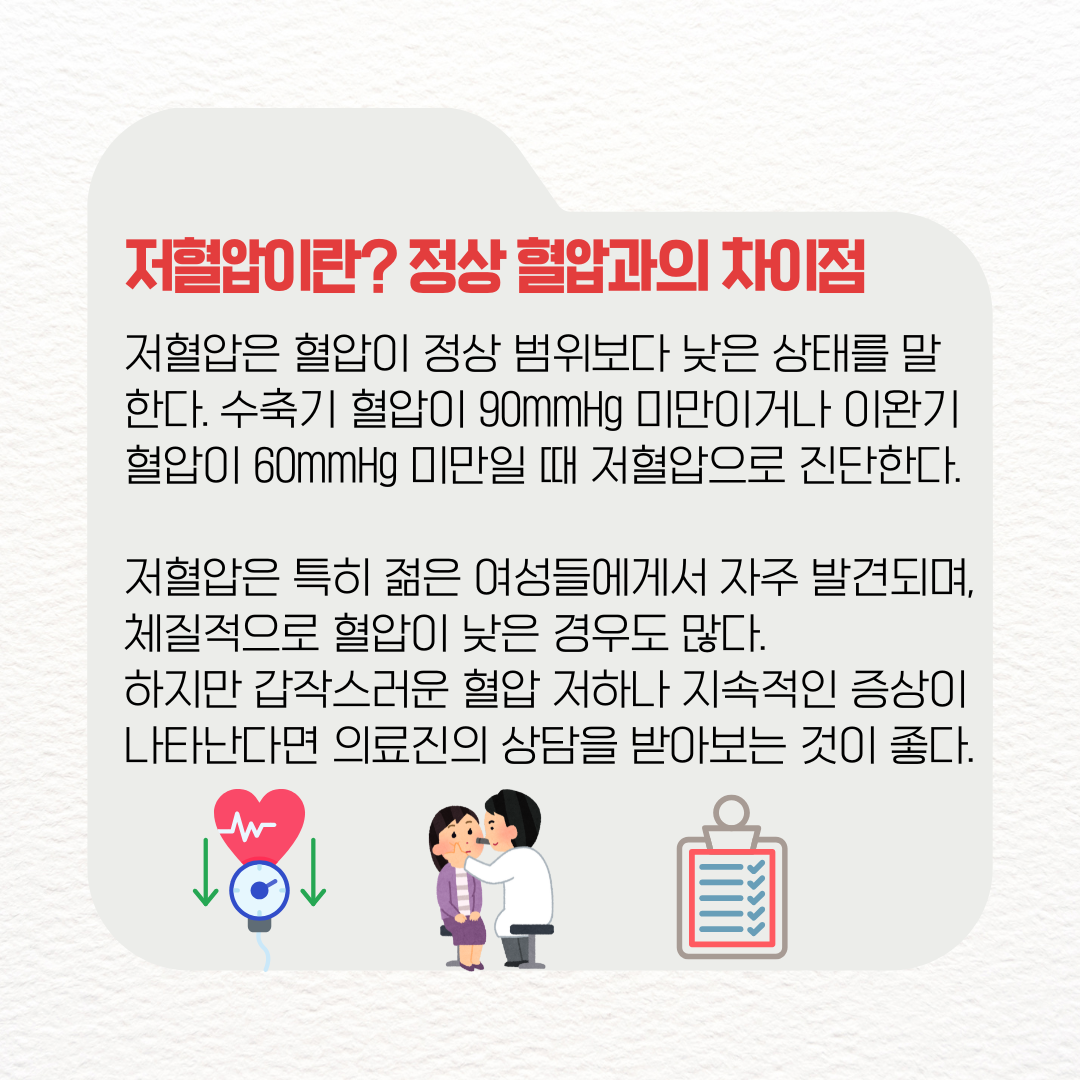 하지만 갑작스러운 혈압 저하나 지속적인 증상이 나타난다면 반드시 의료진의 상담을 받아보는 것이 좋다.