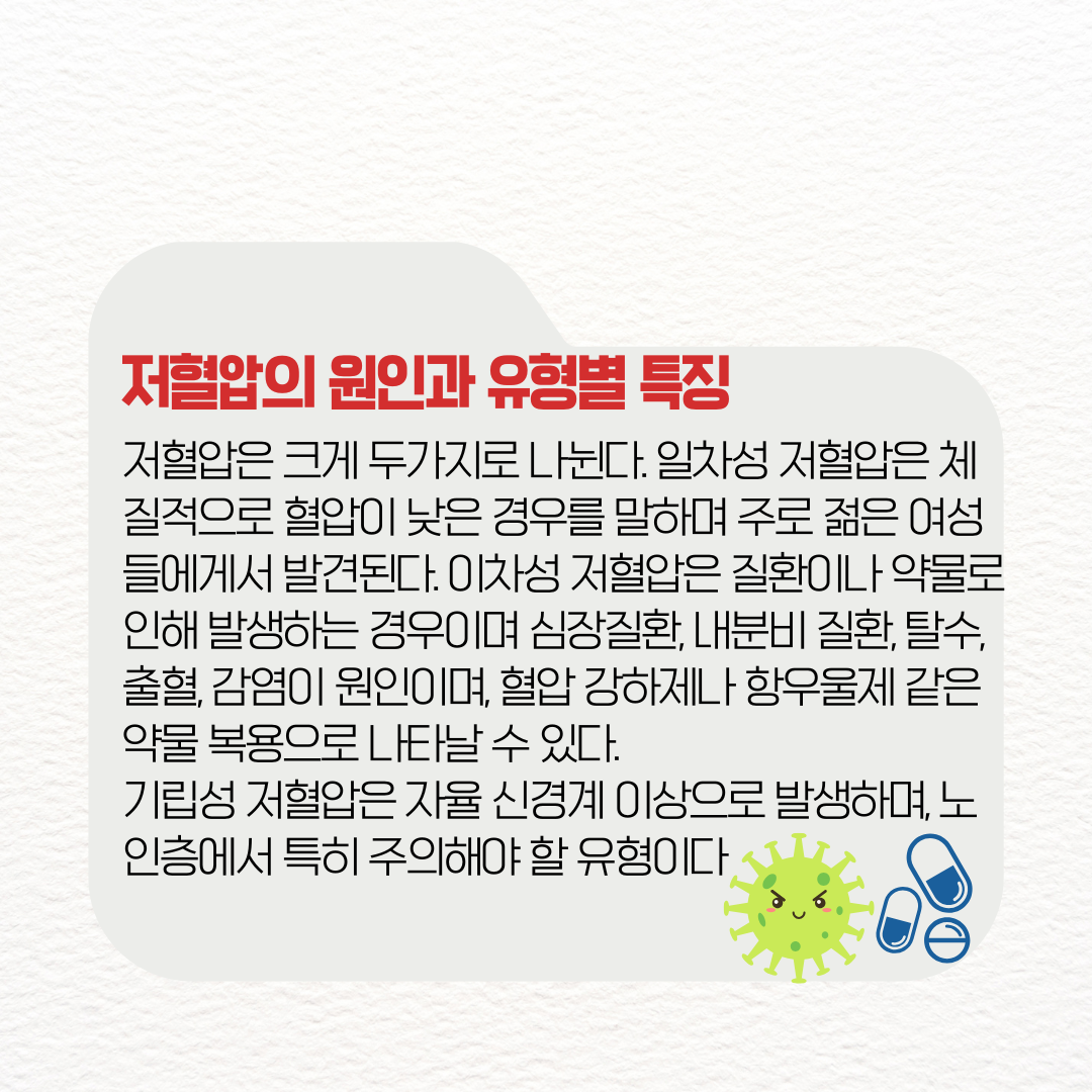 이차성 저혈압은 다른 질환이나 약물로 인해 발생하는 경우입니다. 심장 질환, 내분비 질환, 탈수, 출혈, 감염 등이 원인이 될 수 있으며, 혈압 강하제나 항우울제 같은 약물 복용으로도 나타날 수 있다.