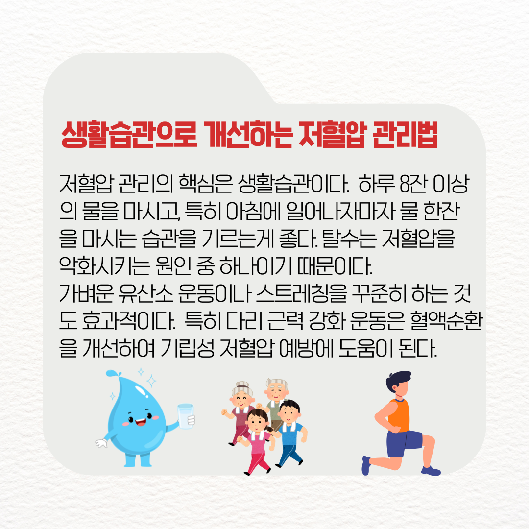 또한 충분한 수면과 스트레스 관리도 저혈압 개선에 큰 도움이 됩니다.