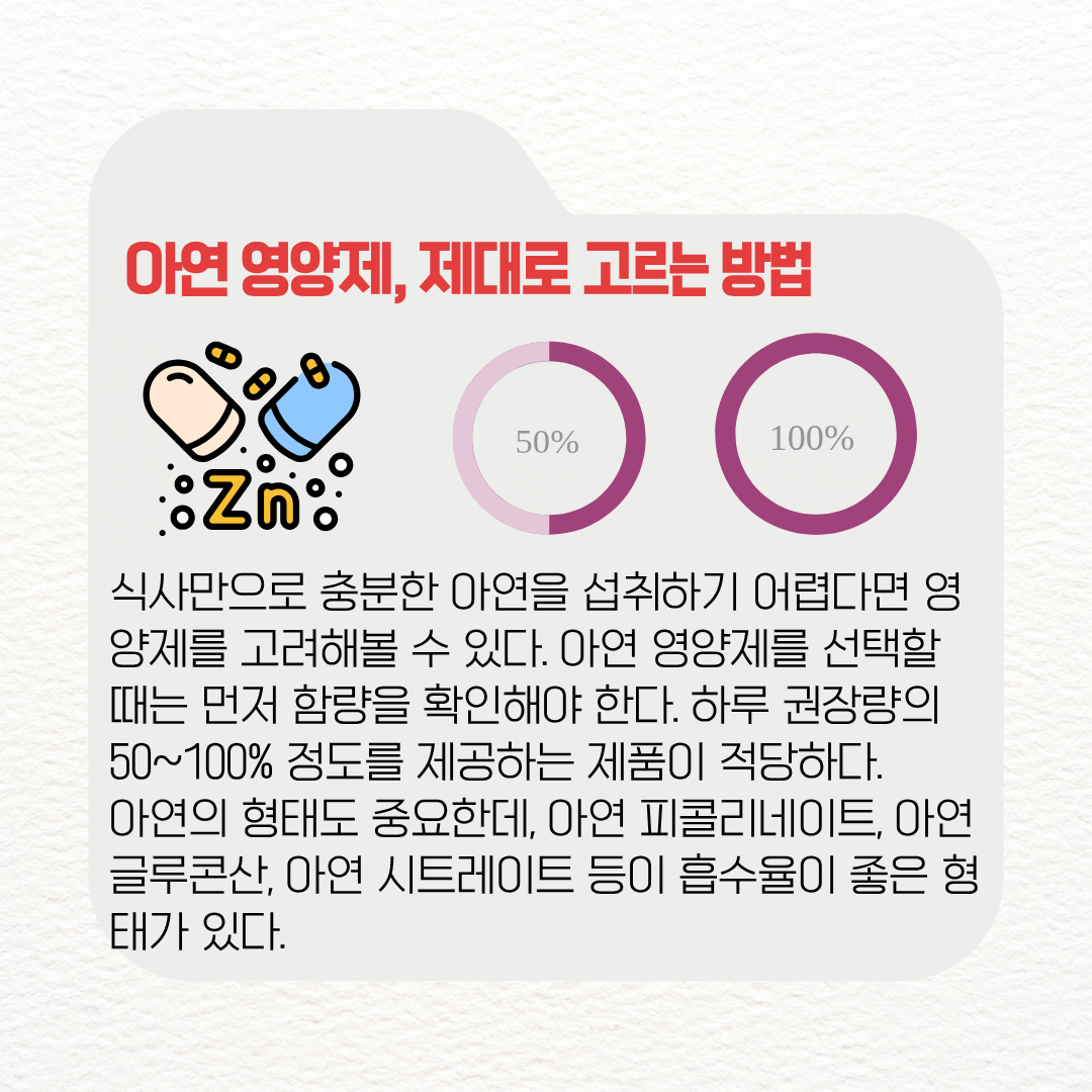 식사만으로 충분한 아연을 섭취하기 어렵다면 영양제를 고려해볼 수 있다. 아연 영양제를 선택할 때는 먼저 함량을 확인해야 한다. 하루 권장량의 50~100% 정도를 제공하는 제품이 적당하다.