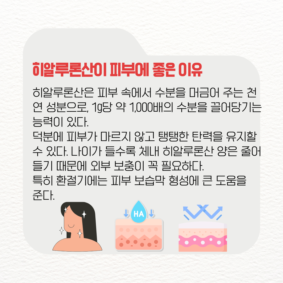 히알루론산은 피부 속에서 수분을 머금어 주는 천연 성분으로, 1g당 약 1,000배의 수분을 끌어당기는 능력이 있다. 덕분에 피부가 마르지 않고 탱탱한 탄력을 유지할 수 있다. 나이가 들수록 체내 히알루론산 양은 줄어들기 때문에 외부 보충이 꼭 필요하다. 특히 환절기에는 피부 보습막 형성에 큰 도움을 준다.