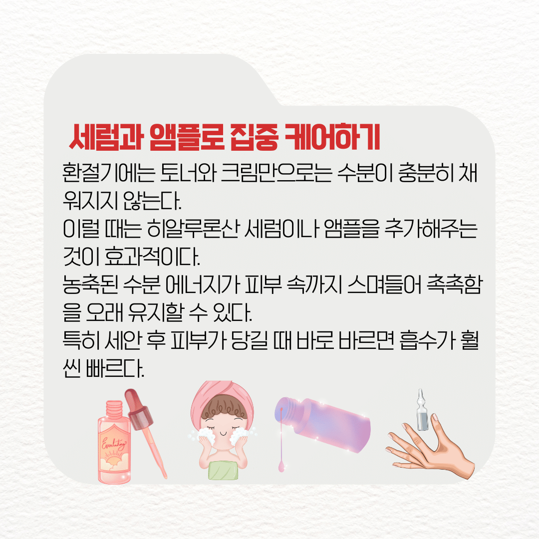 환절기에는 토너와 크림만으로는 수분이 충분히 채워지지 않는다. 이럴 때는 히알루론산 세럼이나 앰플을 추가해주는 것이 효과적이다. 농축된 수분 에너지가 피부 속까지 스며들어 촉촉함을 오래 유지할 수 있다. 특히 세안 후 피부가 당길 때 바로 바르면 흡수가 훨씬 빠르다.