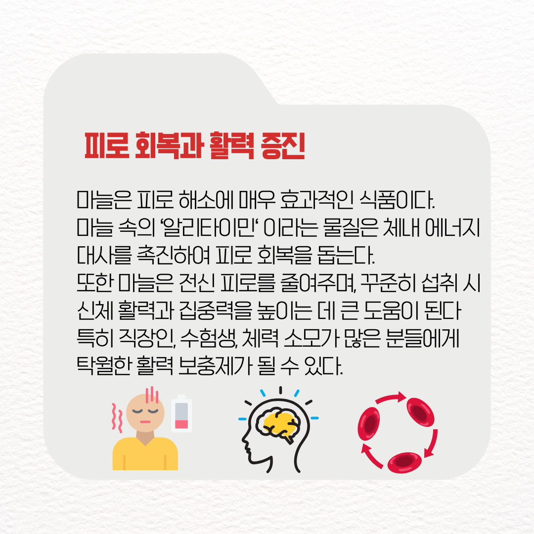 특히 일상에서 쉽게 피로를 느끼는 직장인이나 수험생, 체력 소모가 많은 활동을 하는 분들에게 마늘은 탁월한 활력 보충제가 될 수 있다.