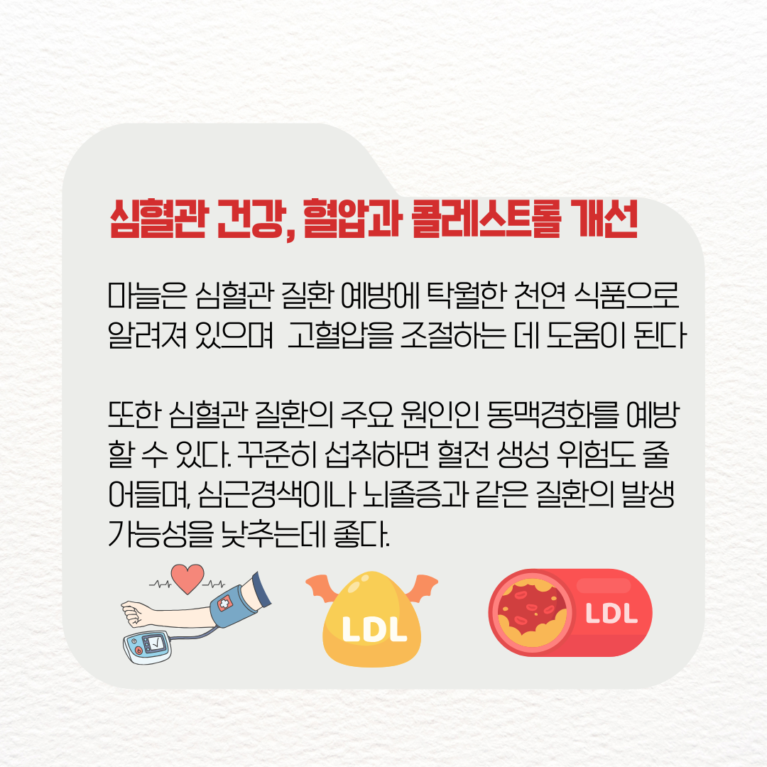 또한, 마늘은 혈액 내 LDL 콜레스테롤(나쁜 콜레스테롤)을 낮추고 HDL 콜레스테롤(좋은 콜레스테롤)은 유지하거나 증가시키는 데 기여하여 심혈관 질환의 주요 원인인 동맥경화를 예방할 수 있다.